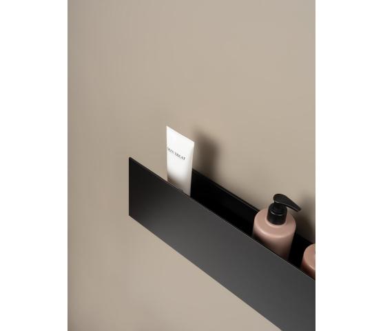 Minimalistiske BOX er stilren oppbevaring for dusjen i matt hvit eller matt svart aluminium.