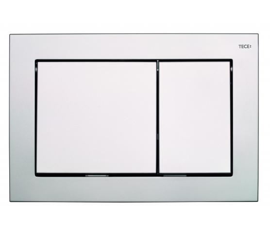 TECEbase betjeningsplate i plast med dobbelspyling. Den smale knappen aktiverer redusert flush, mens den brede aktiverer full flush. TECEbase er relativt liten og passer til alle TECE innbyggingssisterner. Kommer i flere farger, her i matt forkrommet.